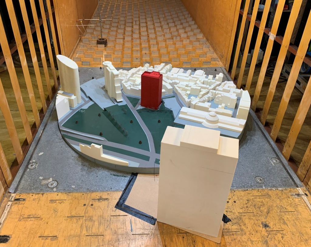 Wind loading needs to be determined in a wind tunnel according to the corresponding standards. Actiflow was asked to perform these wind tunnel experiments. In this case a 1:250 scaled model of the building and the surrounding area was fitted with a total of 161 pressure taps to determine the pressures for 36 10⁰ increment wind directions.